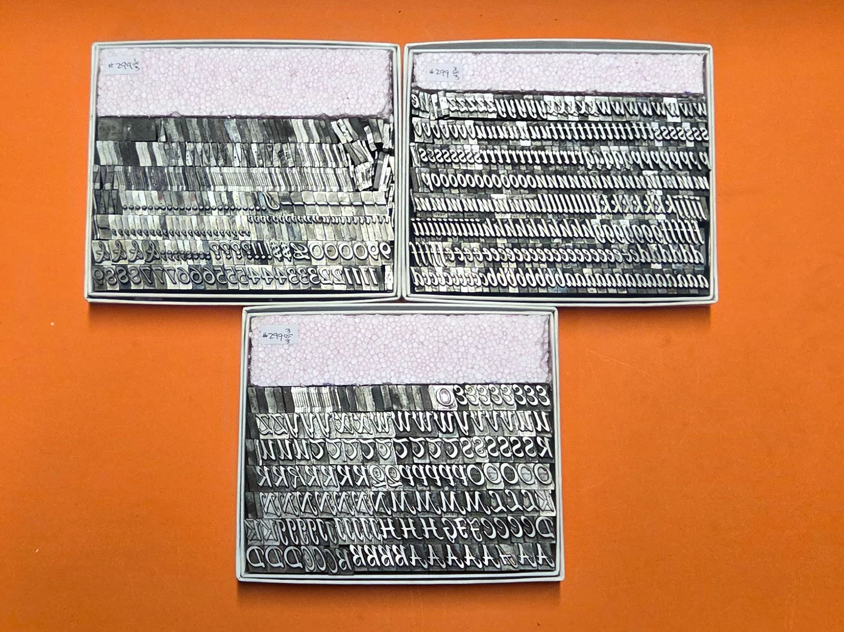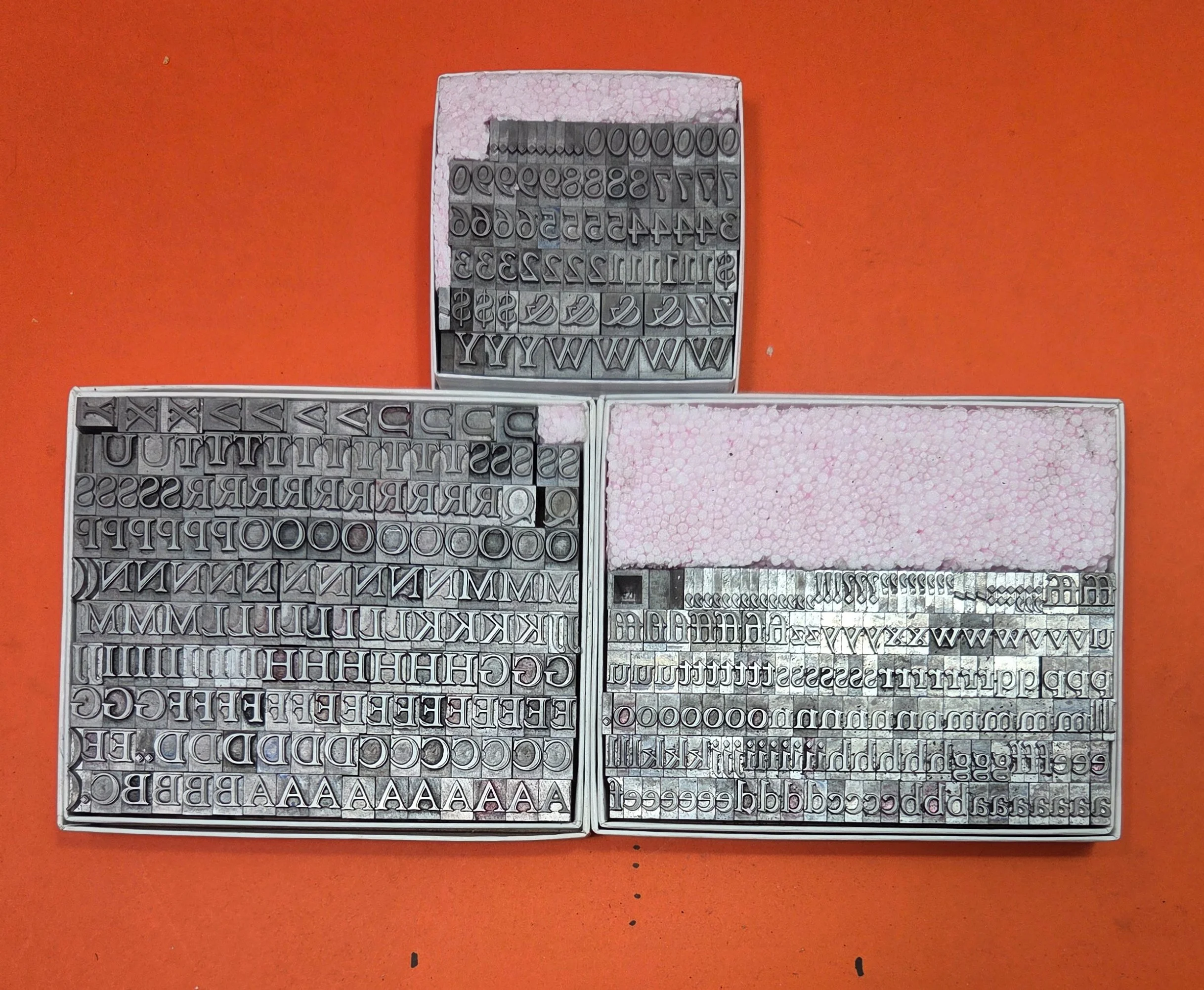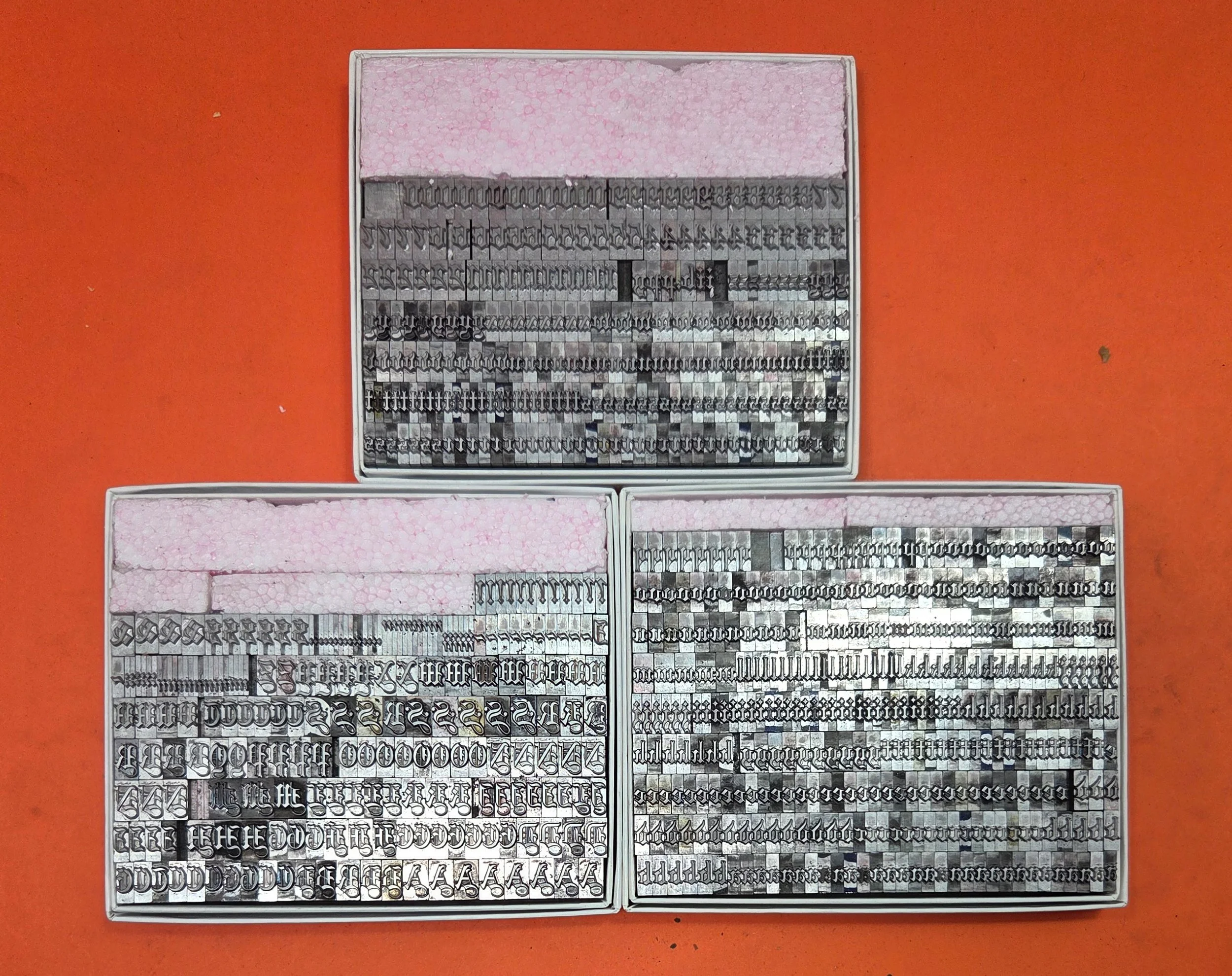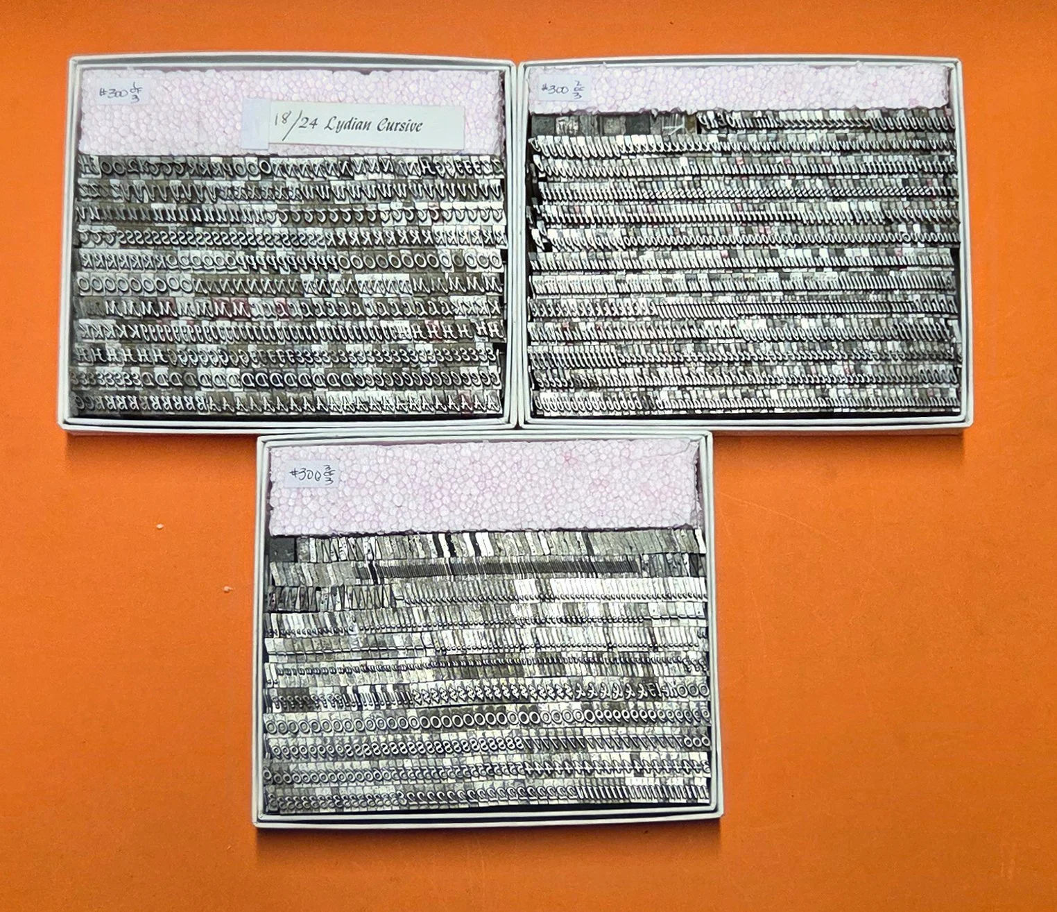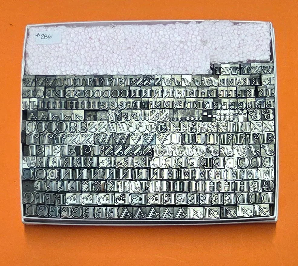 Packaged type - fonts boxed while we were in Chicopee - continue to be unpacked and put out on our counters here in Holyoke. Our storage/display space here is somewhat limited! So we’re going to start posting and keeping 10 fonts on this Page at all times. . . when one sells, it’ll be replaced as quickly as can be until our inventory is reduced to a more manageable level.